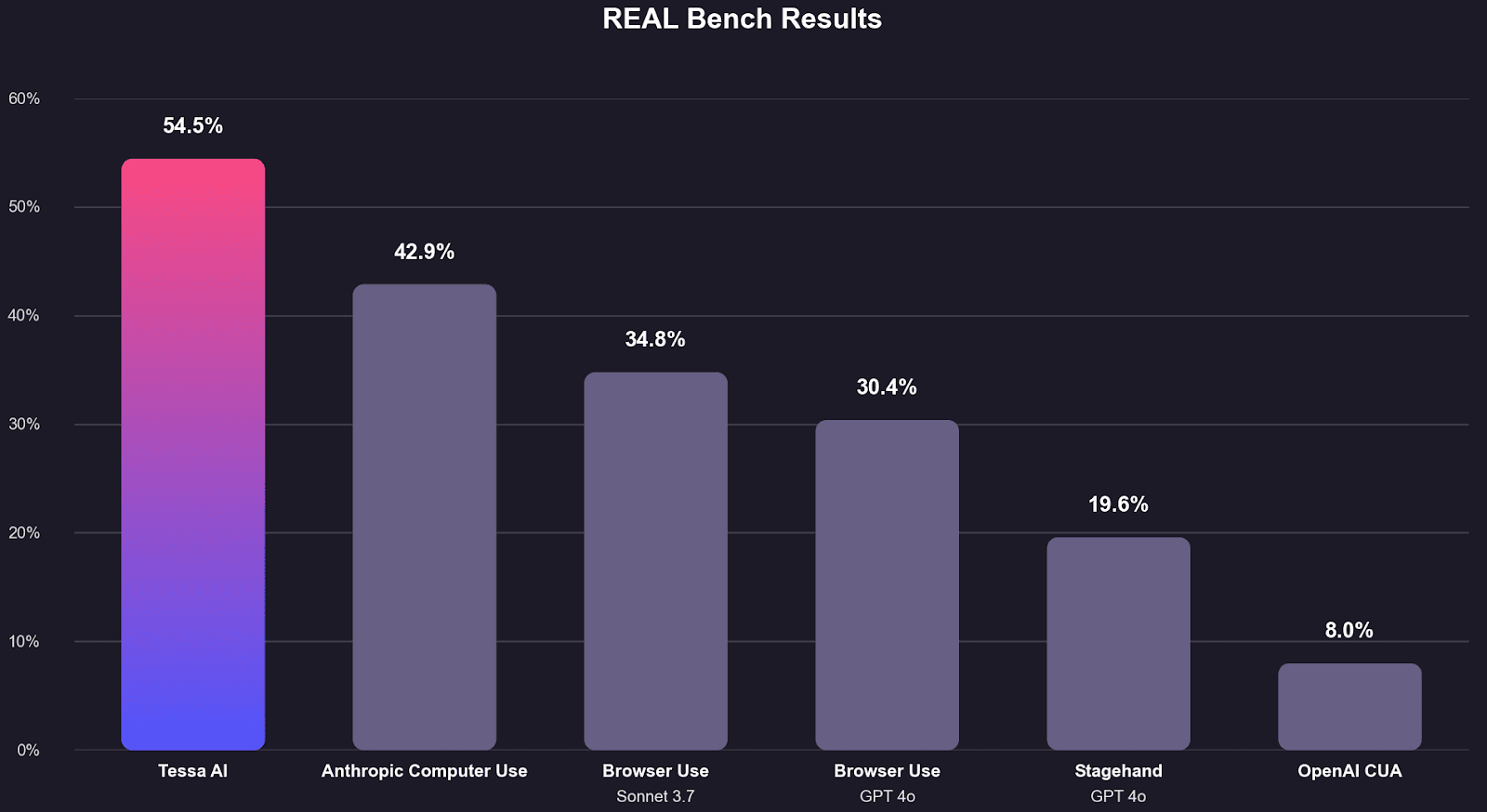 2025 is the year of AI agents. Over the past eight months, we have continued to lead the competition in browsing agents with Tessa, our first product based on our novel architecture of Large Neurosymbolic Cognitive Models. Today, we’re excited to share that Tessa achieves a new state-of-the-art performance on REAL bench, maintaining our status as the leading web browsing agent in the market.