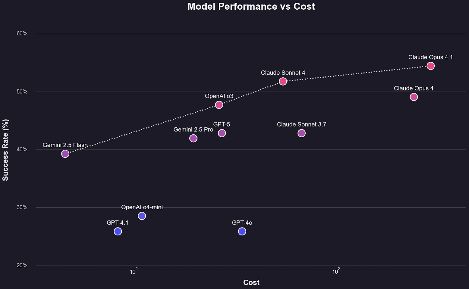 We found that the Claude family of models generally offered the best performance, and models with reasoning abilities generally performed better than their non-reasoning counterparts.